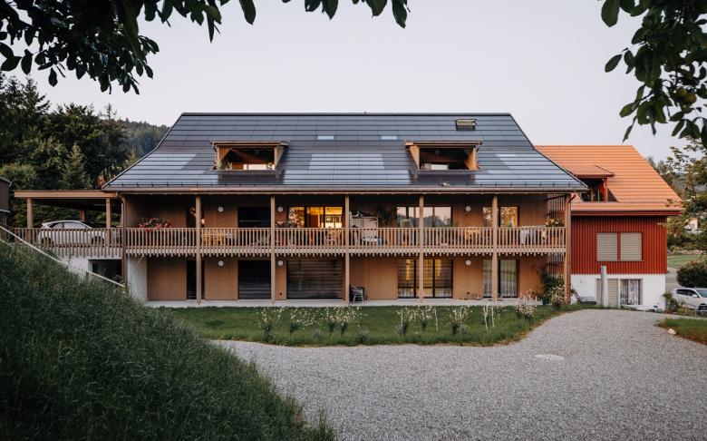 Des modules photovoltaïques intégrés Eternit ont été installés sur toute la surface sud de la toiture de l'ancienne grange. La maison a ainsi obtenu la certification Minergie-A. Durant les journées ensoleillées, le système photovoltaïque produit plus d'électricité que nécessaire. L'électricité restante est utilisée pour la voiture électrique, que les résidents peuvent utiliser pour des déplacements occasionnels dans la région.