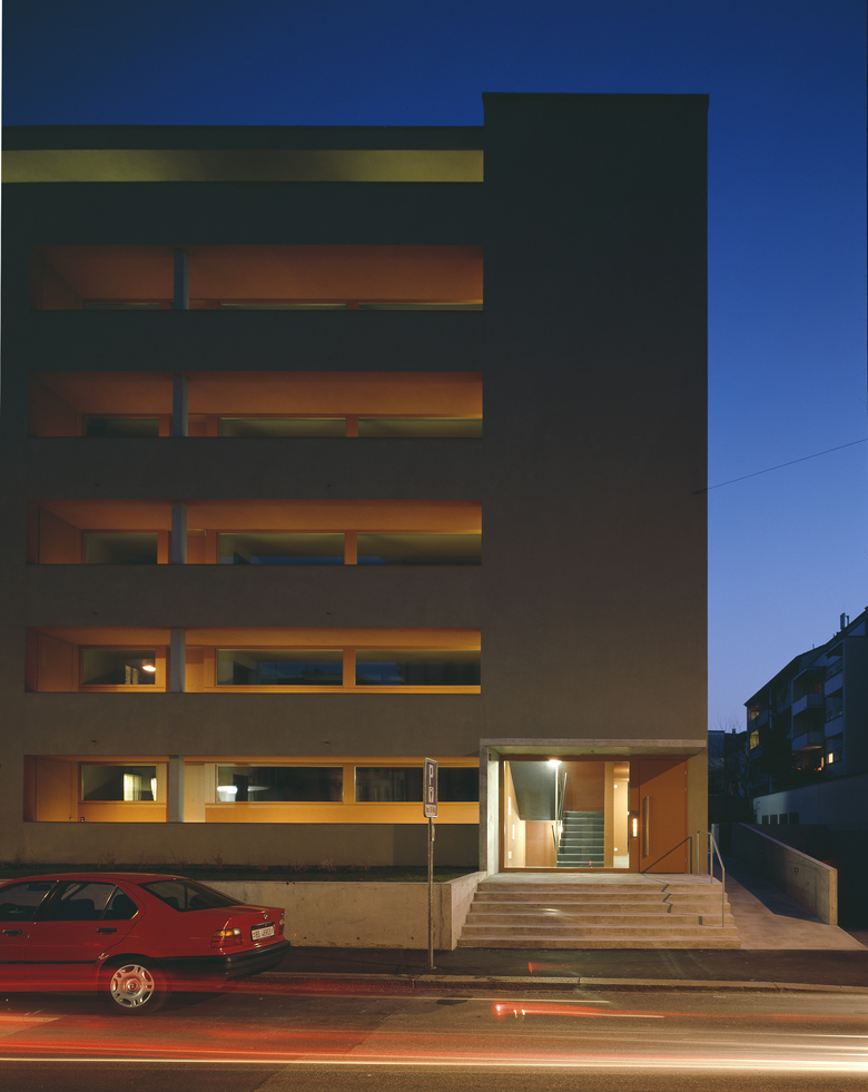 Das Haus wurde ursprünglich für Saisonniers eines Bauunternehmens erstellt und verfügte über 50 kleinteilige Wohnungen. SSA Architekten übernahmen die Schottenstruktur des Gebäudes und die Erschliessung der Wohnungen über strassenseitige Laubengänge, veränderten aber innerhalb des Systems die äussere Erscheinung wie auch die Grundrisse grundlegend. Während die Strassenfassade wie zuvor mit einer deutlichen Bänderung das Erschliessungsprinzip abbildet, wurde die Hoffassade stärker geöffnet und durch ein System von einheitlichen Elementen gegliedert. Über Rücksprünge in der Fassade werden die 2.20 Meter tiefen, gedeckten Balkone ausgebildet.