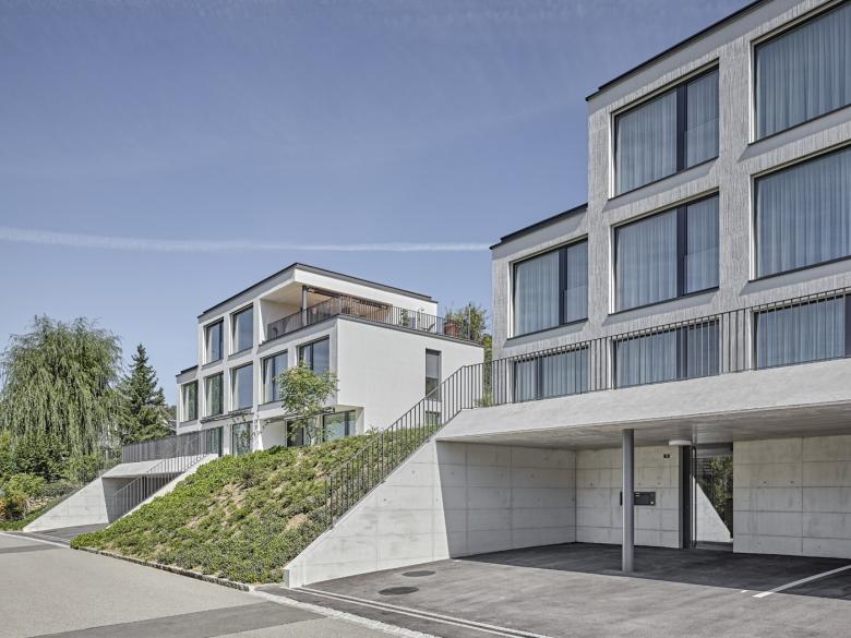 Die beiden identischen Gebäudevolumen bilden autarke Einheiten. Die stringente Gebäudeplanung strukturiert die Wohnungsgrundrisse und ist auch in der Fassade mit ihren grosszügigen Fensteröffnungen nach Westen ablesbar.