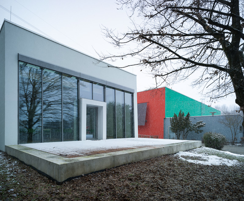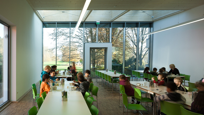 Die Mensa der Grundschule Weststadt ist ein erster Bauabschnitt zur Sanierung des Gebäudekomplexes aus den 1970er- Jahren. Nach einer von uns ausgearbeiteten städtebaulichen Analyse wurde der Standort unter Einbeziehung der großzügigen Freianlagen als Erweiterung des Schulgebäudes festgelegt. Die Stadt Ravensburg formulierte als Bekenntnis zum Klimaschutz die Anforderung,das Gebäude als zertifiziertes Passivhaus auszuführen, was wir entsprechend umsetzten. In der Mensa werden circa 130 Essen je Mittag ausgegeben. Die Farbgebung des Gebäudes mit der weißen Außenhülle ist Teil des von uns für den ganzen Schulkomplex ausgearbeiteten Farbkonzeptes. Im Sommer 2012 erhielt das Gebäude noch die wichtige Terrasse vor der östlichen Glasfront.