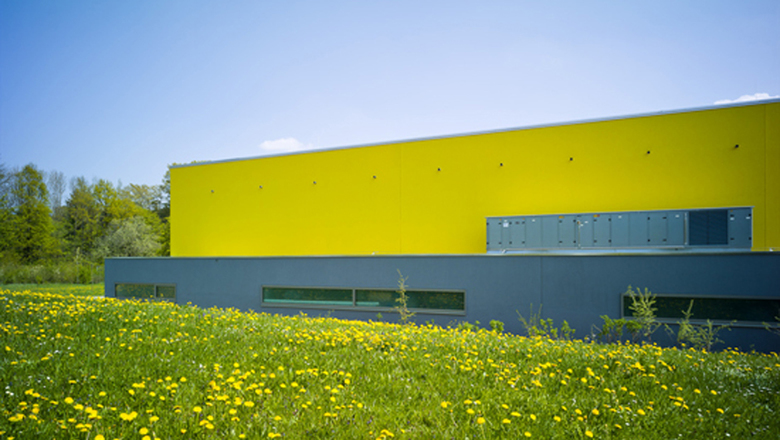 Die Sporthalle der Grundschule Weststadt wurde in den 1970er-Jahren als Stahlbetonskelettbau mit einer Bekleidung aus Betonfertigteilen errichtet. Das Gebäude wurde rundum neu eingekleidet, wobei aus Gründen der Nachhaltigkeit eine hinterlüftete Hartschalenbekleidung mit einer Putzauflage gewählt wurde. Dies wiederum ermöglichte die Ausführung eines Farbkonzeptes mit sehr kräftigen Farben des Le Corbusier Farbfächers. Jede Himmelsrichtung erhält eine eigene Farbe. In der später geplanten Sanierung des Schulgebäudes wird dieses Farbkonzept weiterentwickelt. Der Heizwärmebedarf ist drastisch gesunken, und die stark frequentierte und vormals triste Halle hat eine völlig neue Anmutung. Photovoltaische Silizium-Dünnschichtmodule geben der Halle eine futuristische Anmutung. Das Projekt wird mit der weiteren Sanierung der bestehenden Grundschule fortgesetzt, zwischen Grundschule und Sporthalle liegt die neu errichtete Mensa. Die Sanierung der Sporthalle erhielt für das Farbkonzept eine Anerkennung im Europäischen Farbdesign-Preis 2010-2011.