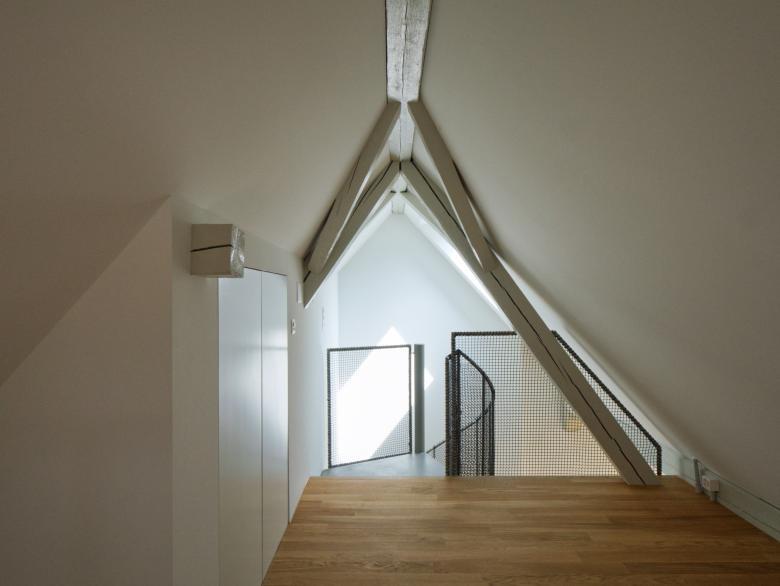 Im ursprünglichen Altbau mit dem steilen Satteldach wurde die Raumstruktur nur minimal angepasst, Fassaden und Holzwerk wurden detailgetreu restauriert, blieben aber unverändert.