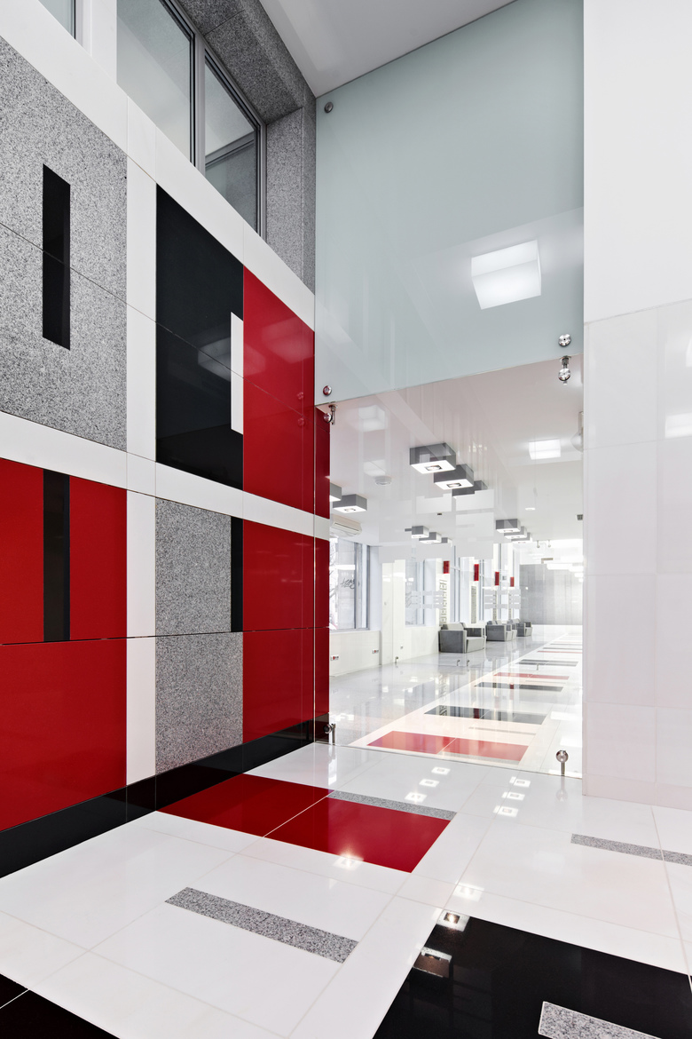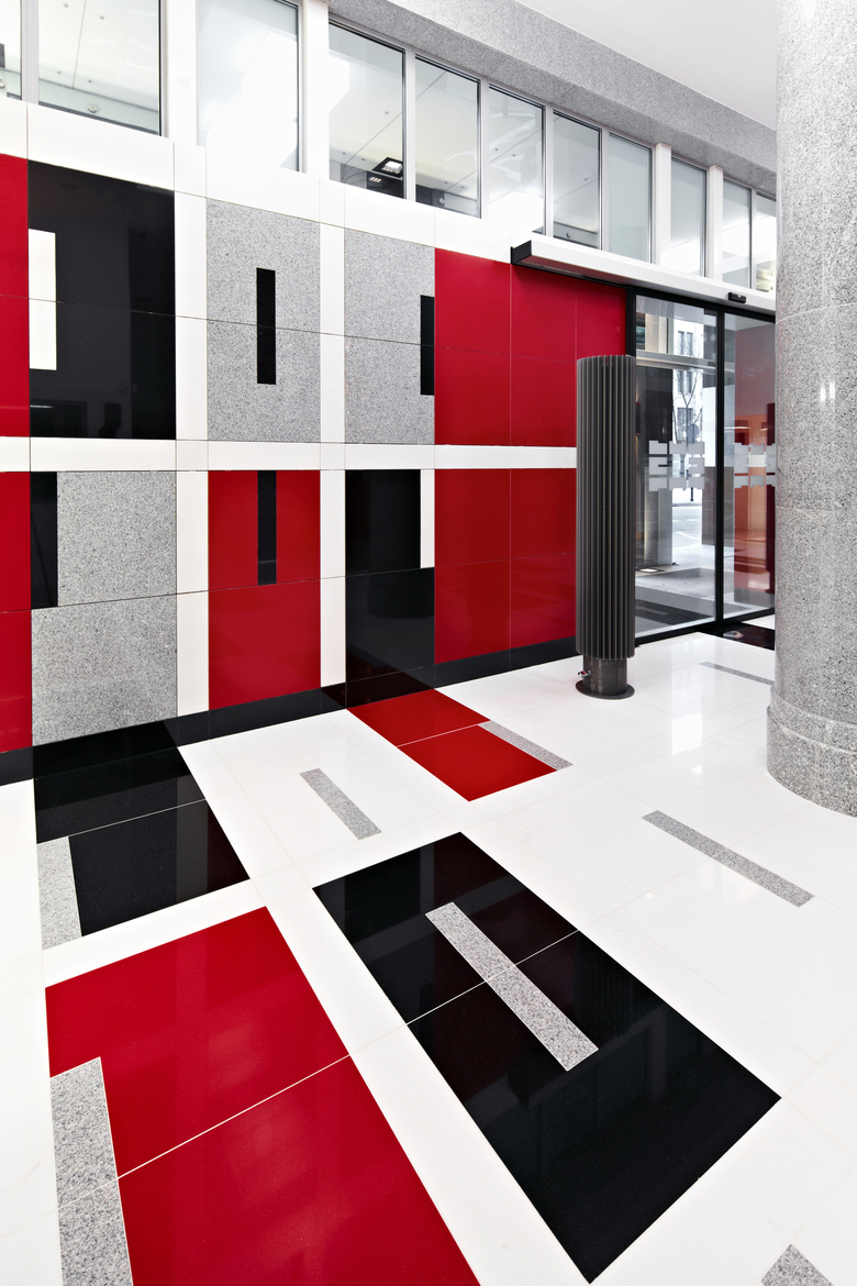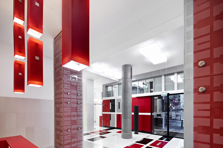 The finished floor is composed of three types of natural stone and bright red stone conglomerate. The clash of the predominant white with grey, black and red accents creates a unique pattern of detail. This detail dominates the interior. Besides the floor, it can be found in the entrance wall in a monochromatic version, lending character to the columns located at both sides of the reception desk. A three-dimensional version of this pattern, in laser-cut stainless steel plates, conceals niches for radiators.