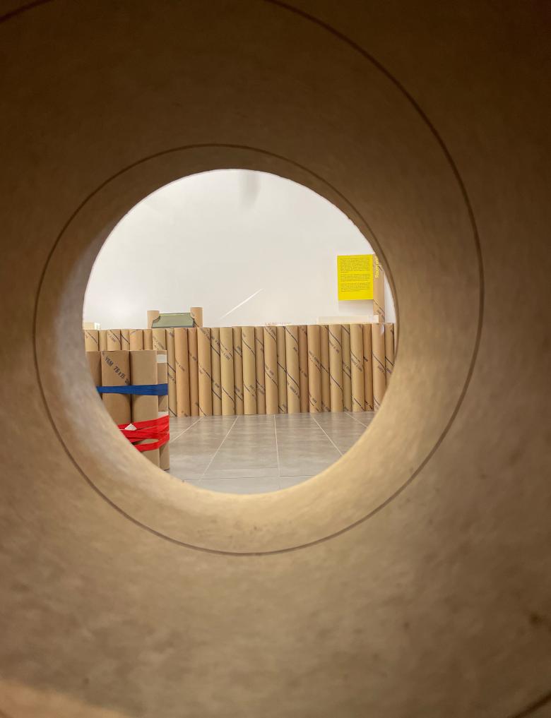 Statt neu produzierte Materialien zu verwenden, greift die Ausstellung bewusst auf bestehende Ressourcen zurück. Pappröhren aus einer lokalen Druckerei, die sonst Abfall wären, bilden die tragende Struktur der Inszenierung. Nach der Laufzeit erhalten sie eine neue Nutzung, etwa im Möbelbau, in Schaufenstern oder Kindergärten. Die Vision, Materialien nicht zu entsorgen, sondern weiterzudenken, wurde konsequent realisiert – nichts blieb übrig, alles fand eine neue Form.