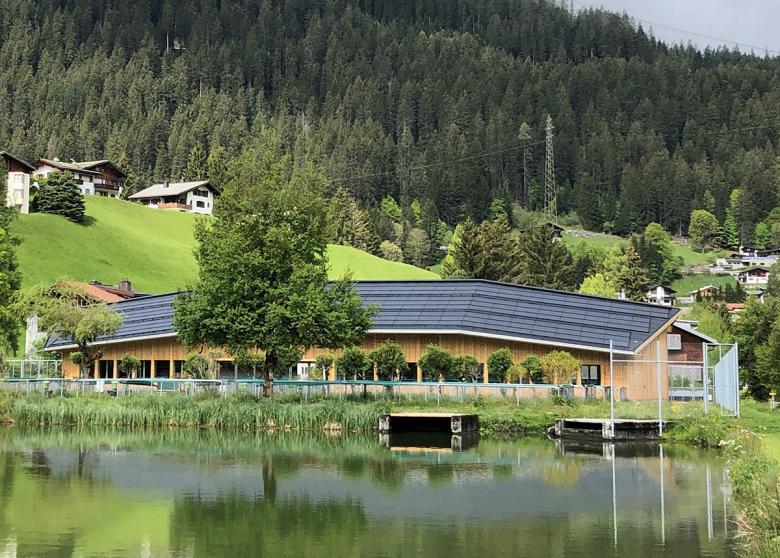 Der Neubau der Fischzuchtanlage in Klosters setzt architektonisch und technisch neue Massstäbe: Das markante Dach trotzt enormen Schneelasten, während eine dachintegrierte Photovoltaik-Anlage genug Strom für den eigenen Betrieb liefert. Wegen den hohen Schneelasten wurden die Glas-Glas-Module von Swisspearl ausgewählt, die eine Belastung von 10.5 kN/m2 aushalten.