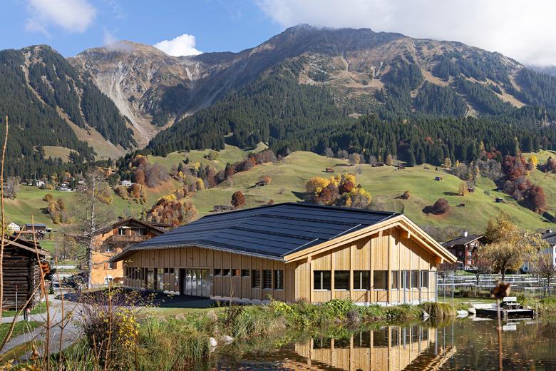 Für die Fundamente, die Bodenplatte und die Wände im Erdgeschoss kam Recyclingbeton zum Einsatz, da Schnee und im Fischzuchtbereich Wasser dem Holz zu schnell zugesetzt hätten. Ausserhalb des sogenannten Spritzbereichs ist Holz das vorherrschende Material. Es wurde weder gestrichen noch veredelt. Die Fassade aus regionaler Fichte wird durch ein Pfostenraster gegliedert. Da und dort sind Ornamente in die Fassade geschnitten, die auf die lokale Bautradition verweisen.