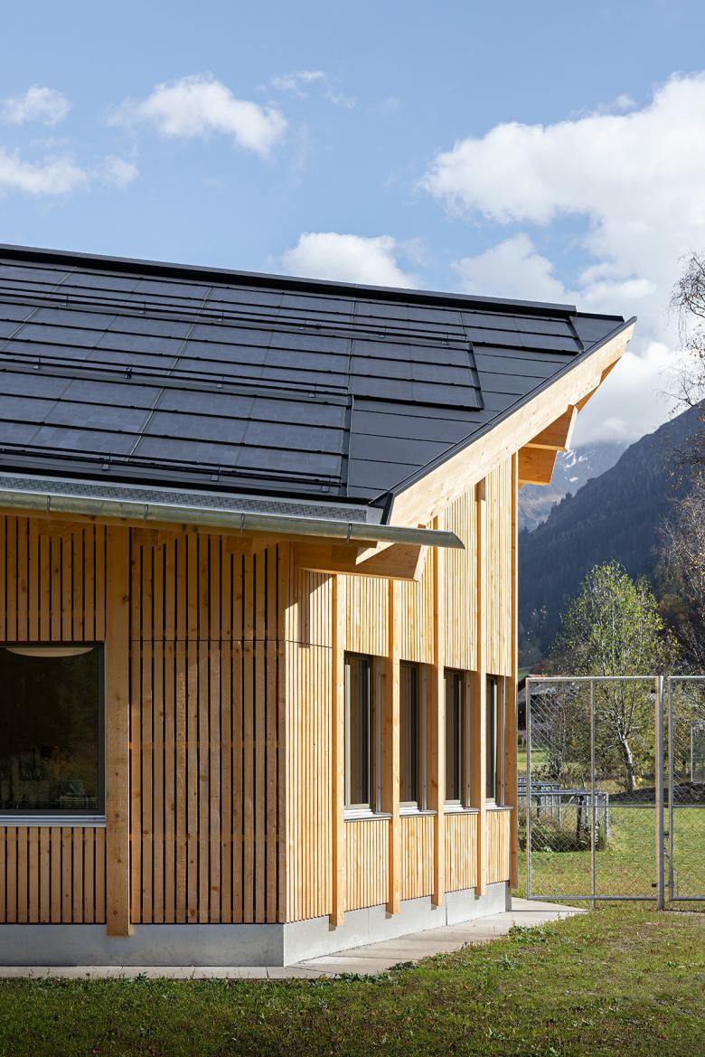 Der Neubau steht am südlichen Dorfrand von Klosters. Seine helle Fassade aus regionaler Fichte wird sich mit den Jahren den dunkleren Nachbarsbauten angleichen, doch mit seinem expressiven Dach hebt sich das Gebäude – vor allem aus der Ferne und von oben – deutlich ab.