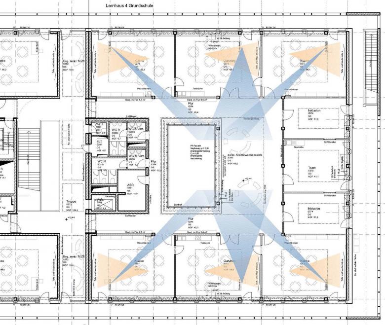 Das viergeschossige Grundschul- und Mittelschulgebäude sowie die niedrigere Sporthalle werden auf dem beengten Grundstück als kompakte Solitäre in die bestehende Parklandschaft eingefügt, mit größtmöglicher Distanz des Schulgebäudes zur kleinteiligen Nachbarbebauung. Der Hauptzugang zum Schulgrundstück erfolgt nördlich über den öffentlichen Vorplatz von der Rockefellerstr., ein zweiter Zugang südlich von der Parkseite. Grund- und Mittelschule als eigenständige Einheiten mit jeweils viergeschossig übereinander angeordneten Lernhäusern in den Kopfbereichen der Schule, jeweils eigenem Zugang und eigener vertikaler Erschließung. Lernhausmitte als Multifunktionsraum für flexiblen Gruppen- oder Einzelunterricht. Separate Sanitär- und Abstellräume je Lernhaus. Außenliegender Fluchtbalkon ermöglicht flexible Möblierung und Nutzung der Lernhausmitte. Gemeinsame Mitte für beide Schulen ist die zweigeschossige Aula (für ca. 775 Pers.) mit Mensa.