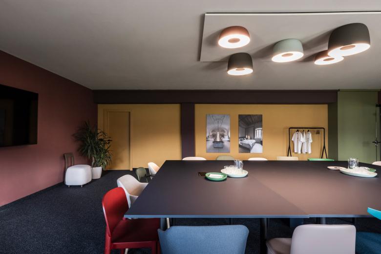 Extremely captivating in the lobby, but ubiquitous throughout the office, is the six-colour scheme, which gives the space a compositional narrative and transforms it into a place of intense sensory experience. The decision to add a variety of colours to the space has several reasons: Firstly, the confidence gained over the years that the use of particular colour combinations gives interior spaces an immersive identity. Projects such as Weisses Kreuz and Aeon are good examples of this. Secondly, the desire to showcase NOA's diversity (active in the field of urban planning, architecture, interior, furniture, lighting, and product design) through the six colour tones. Finally, the ability of colours to highlight each architectural element, be it old beams, new walls, or adapted ceilings, thus creating a stage-like spatial ensemble.