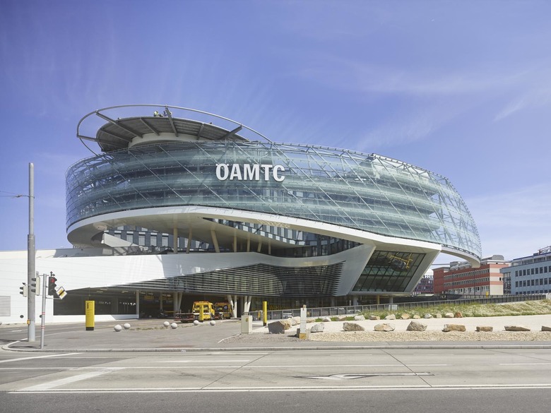 In der Figur setzt sich die ÖAMTC Zentrale eindeutig und bewusst von den monotonen und dennoch heterogen verstreuten, block- und riegelhaften Gebäudezuschnitten der Umgebung ab, deren Form ausschließlich auf gewerbliche- und industrielle Inhalte und deren optimierte Funktionen ausgelegt ist. Vielmehr geht es um die soziale Komponente von Hilfe und Unterstützung und um das Eingebundensein in ein Netzwerk von Service und Betreuung – sowohl als Kommunikationsfaktor im Makrobereich der Gebäudegesamtstruktur als auch im Layout der einzelnen Organisationseinheiten.