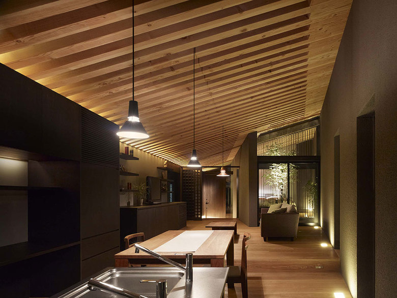 The interior floor levels in this residence are adjusted in response to the elevation of the fields and Japanese garden adjoining it. A shed roof sets the angle of a sloped ceiling in the simple interior space, which is divided by two angled walls. These two simple design devices create an interior environment that is richly varied both horizontally and vertically, as well as closely integrated with the environment surrounding it.