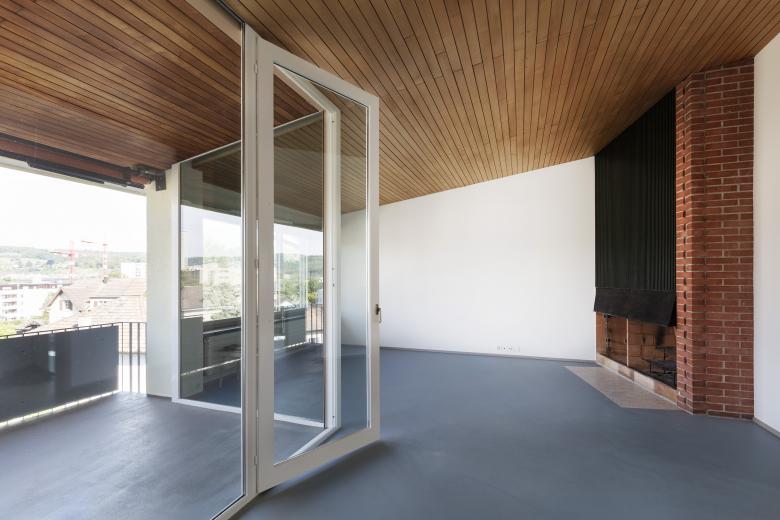 Auf der Wohnseite wurden die Wohn- mit den Schlafzimmern zusammengelegt. Konische Wandelemente nehmen die Geometrie der Balkone im Zeitgeist des Neubaus auf und fassen den Wohnbereich klarer als Raum. In der 3.5-Zimmer-Wohnung entsteht durch diese Gliederung ein zentraler Essbereich vor dem Balkon. Die Raumfolge findet gegenüber eine Fortsetzung in ein Studio, das über eine Schiebetüre abtrennbar als Arbeitsraum oder Zimmer für ein Kleinkind diesen kann. Die neue Querorientierung dieser Räume entlastet die an sich etwas ungünstigen Raumproportionen. In der 2.5-Zimmer-Wohnung trennen sie einen Essplatz mit Wohnküche vom Wohnbereich ab. Ein frei verlegter Eichenparkett mit Fries unterstützt diese Enfilade.