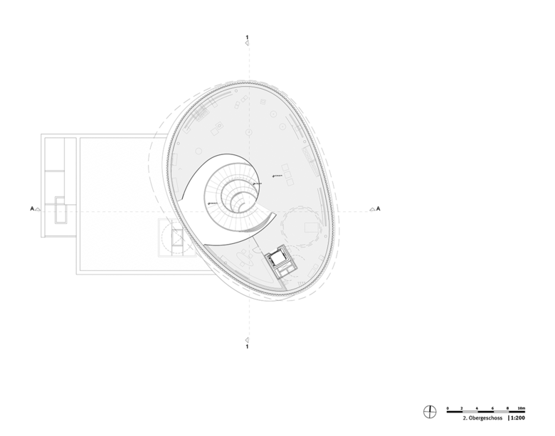 The centre of the “Wunderkammer des Brotes” is formed by a circular atrium, in which selected items from the collection are individually suspended from the top, as in a differentiated crystal chandelier. The atrium is enclosed by a spiral stair where visitors can look at the exhibited items from various perspectives. The stair provides access to the two exhibition levels, where the objects are presented with the help of walls, tables and cabinets that are integrated into the architecture. Additionally, all floors can be accessed by elevators. The atrium is naturally illuminated from above while the exhibition spaces have artificial light.