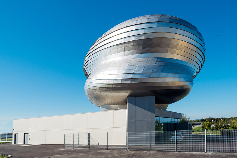 The Customer Information Centre and Event Forum PANEUM – Wunderkammer des Brotes - for the company Backaldrin in Asten consists of two elements: a box shaped plinth building with foyer and event rooms plus the “Wunderkammer des Brotes”, a two storey freeform exhibition area floating on top. The chosen materials augment the contrast of these two elements: The square base building shows a cast-in-place concrete façade while the rounded wood structure of the museum is clad with stainless steel shingles.