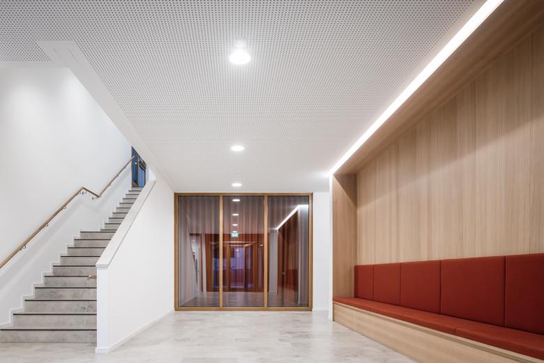 Im Inneren zeigt sich das Haus hell und freundlich – durch hochwertige Materialien wie Eichenparkett, Holzfenster und Jurakalksteinplatten in den Gängen sowie durch eine schlichte Farbpalette in Weiß, Grau und Holztönen. Dicke Filzvorhänge in Rostrot bringen Gemütlichkeit hinein. Durch Einbauten und Sitznischen aus Holz wirkt das Haus mit seinen insgesamt 600 Quadratmetern Nutzfläche stets aufgeräumt. Mittelpunkt ist der große, im Flachdachkubus untergebrachte Pfarrsaal im ersten Obergeschoss, der sich durch Schiebetüren in zwei Säle (Maria und Josef) teilen lässt und von der zentralen, direkt angegliederten Küche aus versorgt werden kann. Von dort hat man durch große Fenster stets den Blick ins Grüne am Hang. In den weiteren Geschossen befinden sich kleinere Räume: Im Erdgeschoss gibt es einen Jugend- sowie einen Meditationsraum, im zweiten Obergeschoss drei weitere Veranstaltungsräume. Alle Etagen haben Zugang zum Freien. Erschlossen werden sie durch geräumige und lichtdurchflutete Flure sowie Foyers, ein Treppenhaus und einen barrierefreien Aufzug. Beheizt wird das Pfarrheim, das nicht unterkellert ist, über eine Holzpelletheizung; gedämmt ist es durch den Einsatz von Porenbetonsteinen in den Wänden.