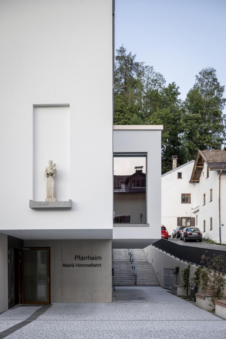 Solide und erhaben präsentiert sich das Gebäude aus Stahlbeton mit drei Geschossen. Es befindet sich an einem Hang im Zentrum von Miesbach – eine Lage, die einige Herausforderungen, aber auch Chancen mit sich brachte. Um alle Nutzungen des Pfarrheims – Treffpunkt der Gemeinde und vieler anderer kirchennaher Vereine in Miesbach – unterzubringen, dabei aber das Volumen nicht allzu groß werden zu lassen, wurde ein Flachdachbaukörper von Osten in das Satteldachgebäude hineingeschoben. Dieser Kniff erwies sich als mehrfach günstig, da dadurch auch ein großzügiger Platz zum Hang hin entstand, der zudem vom angrenzenden Kindergarten mitgenutzt wird. Ein dezenter Dachüberstand, bodentiefe Fenster sowie ein minimal nach innen abgesetzter Sockel lassen die Fassade lebendig erscheinen. Die historische Statue des Heiligen Josef mit Jesuskind hat einen prominenten Platz an der Westfassade des Hauses erhalten und spielt mit dem Kontrast aus Modernität und Tradition. Von seiner Setzung her greift das zur Kolpingstraße ausgerichtete Haus die Formen der umgebenden Häuser mit ihren Giebeln und Kanten auf.