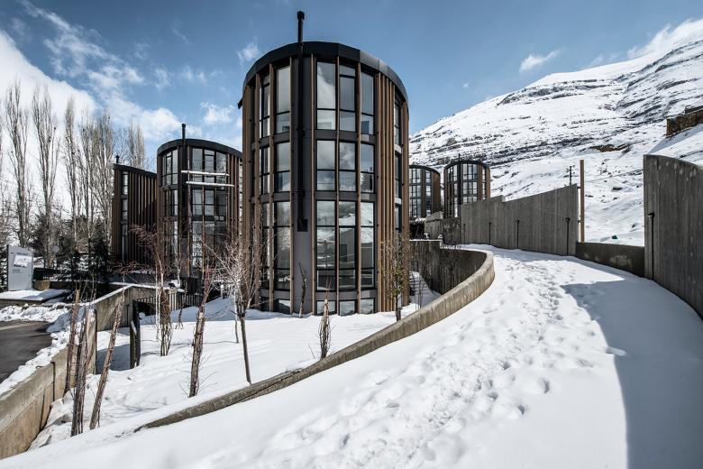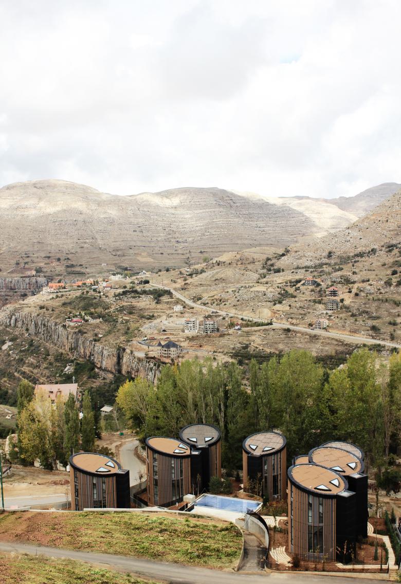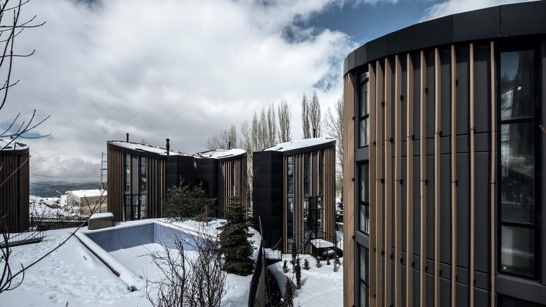 The project consists of 10 independent mountain residences located in Faraya San Antonio, Mount Lebanon, 1600 meters above sea level. The location of the 2845-square-meter site benefits from its adequate distance from the ski slopes (1km).The typical response for an agglomeration of mountain chalets in the area is to group them into a single block, splitting the remaining space into communal areas. In most cases, the required total built-up area results in a dense mass; however, the nature of this commission differs in that it calls for individual pavilions. The proposed scheme was primarily driven by the location and the desire to take advantage of its panoramic views. A circular plan was therefore established in order to prevent “screen” situations where glazed facades typically offer flat views of the surroundings at different orientations, while simultaneously avoiding the notion of having principal, lateral and back facades, which typically imply vis-à-vis and front-to-back situations.