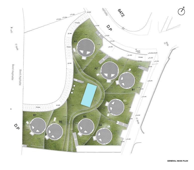 Each villa consists of 5 circular plates of 65 square meters each, with a total of 260 square meters of built-up area per unit. Independent terraced gardens define the individual plot of each property allowing for outdoor visitor access in addition to individual vehicular access from street level provided for each villa independently.