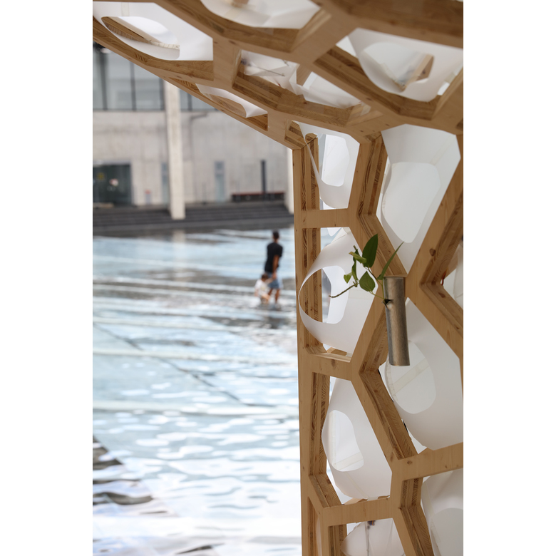 わたしたちはこの難しいテーマに対して、1.「空間を歪ませる」≑「空間にむらをつくり出す」、2.外部の環境を遮断するのではなく環境に応答する建築とする、という方針で臨みました。具体的には、トンボの羽や動物のなわばりなどに見られるボロノイ図形を骨組みのパターンに用いて空間を歪ませ、また、必要に応じて開いたり閉じたりする、外部の環境とやり取りするための数多くの孔を備えた、生き物の様な建築を提案しました。訪れた人がこの茶室の中に入ると、それを感じて、Breathing Pleats(呼吸するひだ)と名付けた孔が呼吸するように開閉し始める仕組みとなっています。