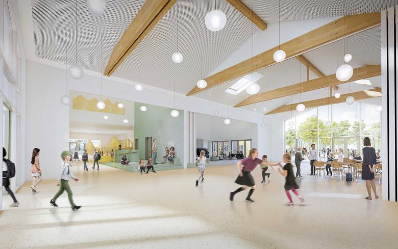 Mit warmen Holzelementen, farbigen Flächen und offenen Lernateliers wird eine freundliche Atmosphäre geschaffen, in der Lernen, Begegnung und Miteinander im Mittelpunkt stehen – ganz im Sinne einer lebendigen Dorfgemeinschaft.