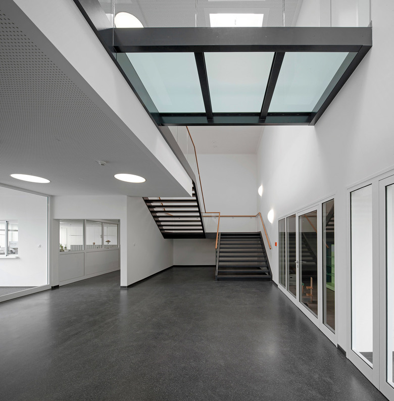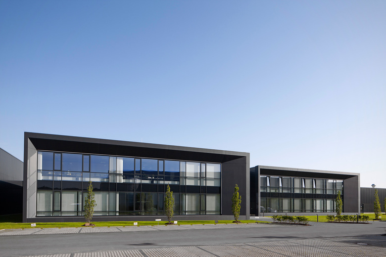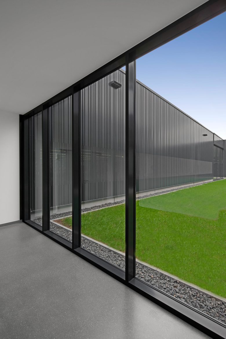 Beim Entwurf des Verwaltungsgebäudes wurde Wert auf eine kundenfreundliche, offene Gestaltung gelegt, dies zeigt sich schon bei der Zufahrt, wo einen Besucher zwei überdimensionale Schaufenster begrüßen und ihn am Work-Flow teilhaben lassen.
