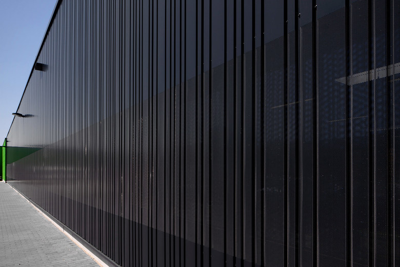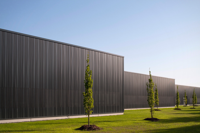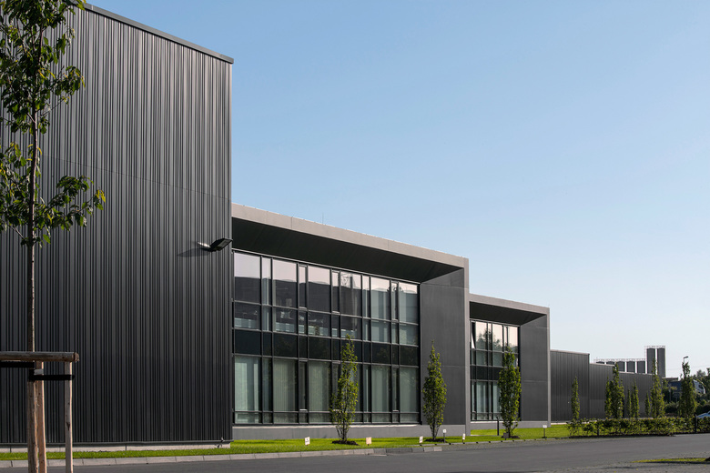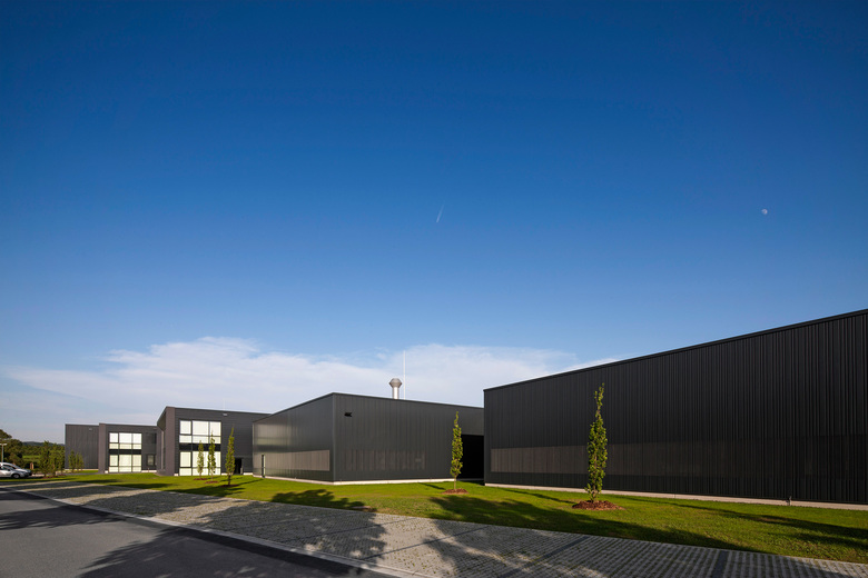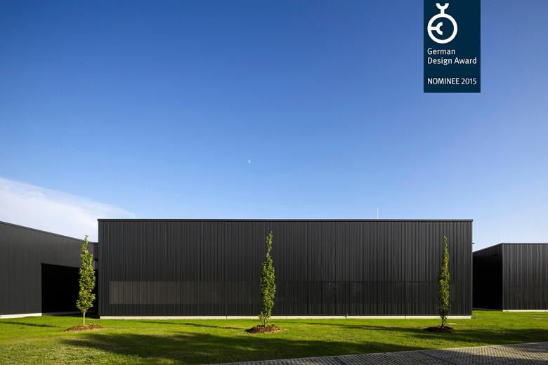Auf Grund der Lage am Übergang zur freien Landschaft, wurde eine nicht-spiegelnde, dunkle Farbigkeit gewählt, die das Gebäude im Landschaftsbild tarnt und zusammen mit der Sonderprofilierung der Blechhaut gleichsam einem Nadelstreifenanzug eine zurückhaltende Nobles erzeugt und dadurch gleichzeitig zeigt, dass hier qualitativ hochwertige Produkte produziert werden.