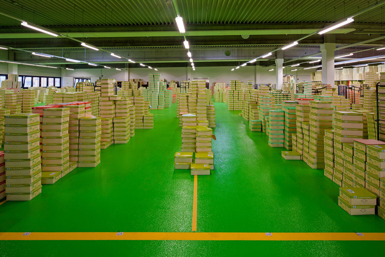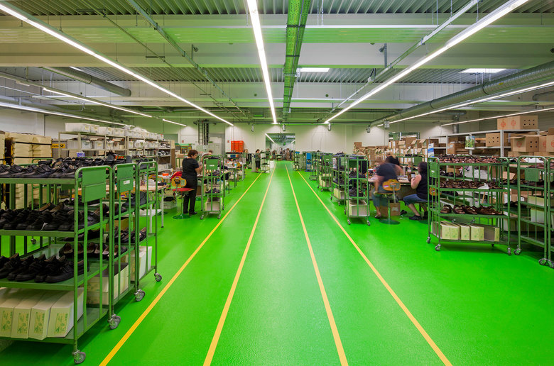 Die Innenraumschalen, sowohl von Produktion als auch vom Büro, die in ihrer Grundkonstruktion aus Beton bestehen, sind einheitlich in hellem Weiß gehalten, während im Büro der Boden in dunkelgrauer und schwarzer Farbigkeit die Seriösität der geleisteten Verwaltungsarbeit widerspiegelt, nimmt in der Produktion ein farbige Industriebodenbeschichtung die Dynamik des Fertigungsprozesses auf. In der Farbigkeit wurde dabei grün gewählt, denn grün transportiert die für die Philosophie der Fa. Finn Comfort wichtigen Schlagworte wie frisch, natürlich, lebendig, aktiv.