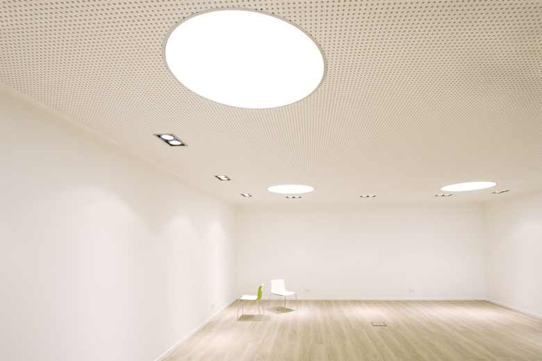Die Fensterflächen werden dabei großflächig durch gelochte Blechtafeln überspielt, dadurch wird den Mitarbeitern ein von äußeren Blicken geschütztes, konzentriertes Arbeiten ermöglicht bei gleichzeitiger großer Transparenz von innen nach außen.