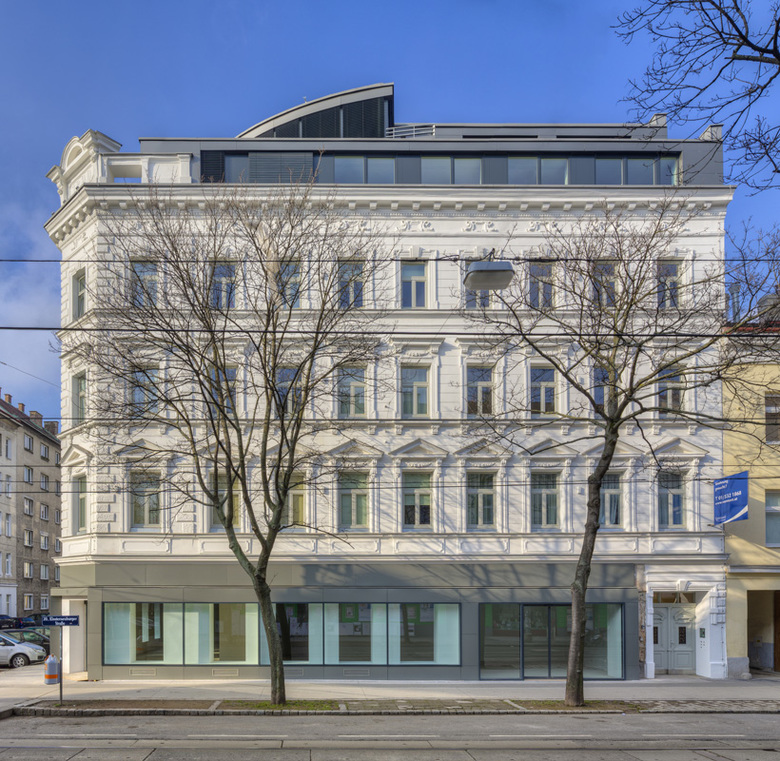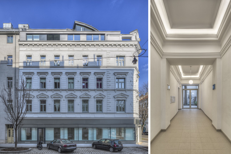 Ausgangssituation – Das Wohn- und Geschäftshaus in der Klosterneuburgerstraße 43 befand sich in einem sehr schlechten Erhaltungszustand vor allem was das Gebäudeinnere und die Innenhoffassade betrifft. Das Gebäude wurde von der Gebietsbetreuung auf der Liste der „Problemhäuser“ im 20. Bezirk geführt. Der Wunsch des Eigentümers war die Sanierung des Bestandes und das Schaffen von zusätzlichen hochwertigen Wohnungen in einem Dachgeschossausbau. Dabei sollte vor allem der Wohnkomfort, die Barrierefreiheit und die thermische Qualität des Gebäudes verbessert werden.