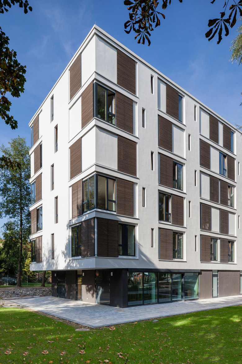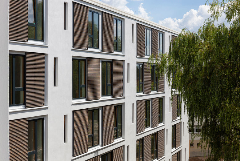 Um den Bewohnern möglichst komfortable Wohnverhältnisse und einen visuellen Außenbezug in den Park auch bei eingeschränkter Mobilität bieten zu können, wurden großzügige Fenster vorgesehen. Der Sonnenschutz wurde durch elegante Holzschiebeläden umgesetzt, die auch im geschlossenen Zustand einen Außenbezug und einen gesteuerten natürlichen Lichteinfall ermöglichen. Die Fassade wirkt durch die strenge und klare Gliederung und durch die der Nutzung geschuldeten spielerischen Varianz des Sonnenschutzes leicht, klar, wertig und lebendig.