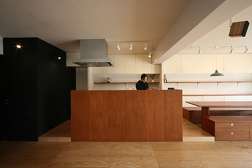 築21年の元社宅の一棟フルリノベーション、リノア元住吉の専有部のひとつ。水回り以外間仕切りのないスケルトンに、いろいろな家具を設定することによって機能に合った居場所を提案した。広がりのあるリビングや上げ床のベッドスペースそしてその下の収納、排水を兼ねて少し床を高くし、全体を見渡せるようにしたキッチン、掘りごたつ風のダイニングエリアなど、高さを様々に変化させることで、ワンルームでも空間に変化を持たせ、緩やかに空間を区切れるようにした。