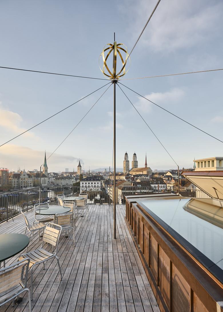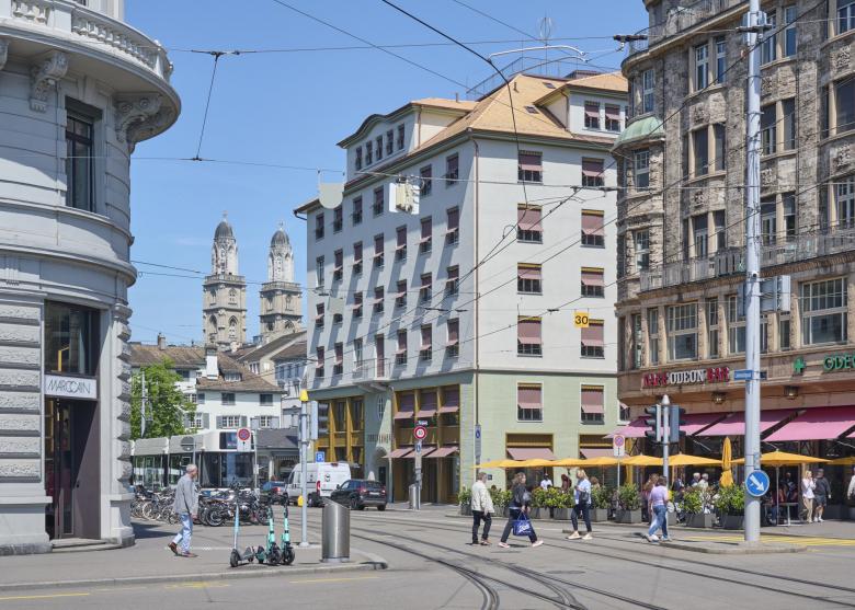 1837 wurde am Limmatquai 4 anstelle der mittelalterlichen Häuser Einsiedlerhof und Reblaube das sechsgeschossige Hotel Goldene Krone bzw. Zürcherhof errichtet. Der stringente, mächtige Bau an der Achse zwischen Bellevue und Grossmünster war berühmt für seine Aussicht von der Dachterrasse auf Stadt und See. 1907 wurde das Gebäude umgebaut in ein Geschäftshaus mit Kino und Café. Die Jugendstilelemente wurden in späteren Umbauten, vor allem in der Purifizierung in den 1920er-Jahren, grösstenteils entfernt.