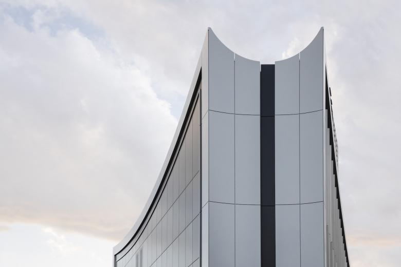 本プロジェクトのタワー棟と呼応する大きなアーチが特徴的なファサードは、風を受けた船の帆のように軽やかさをダイナミックに表現している。