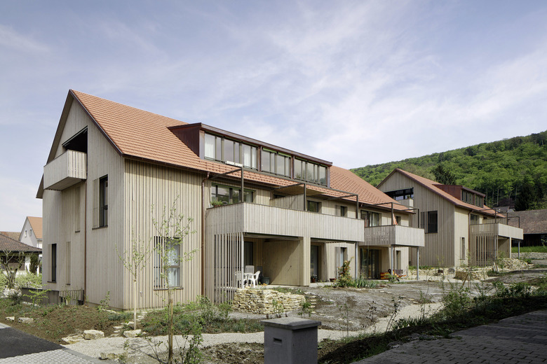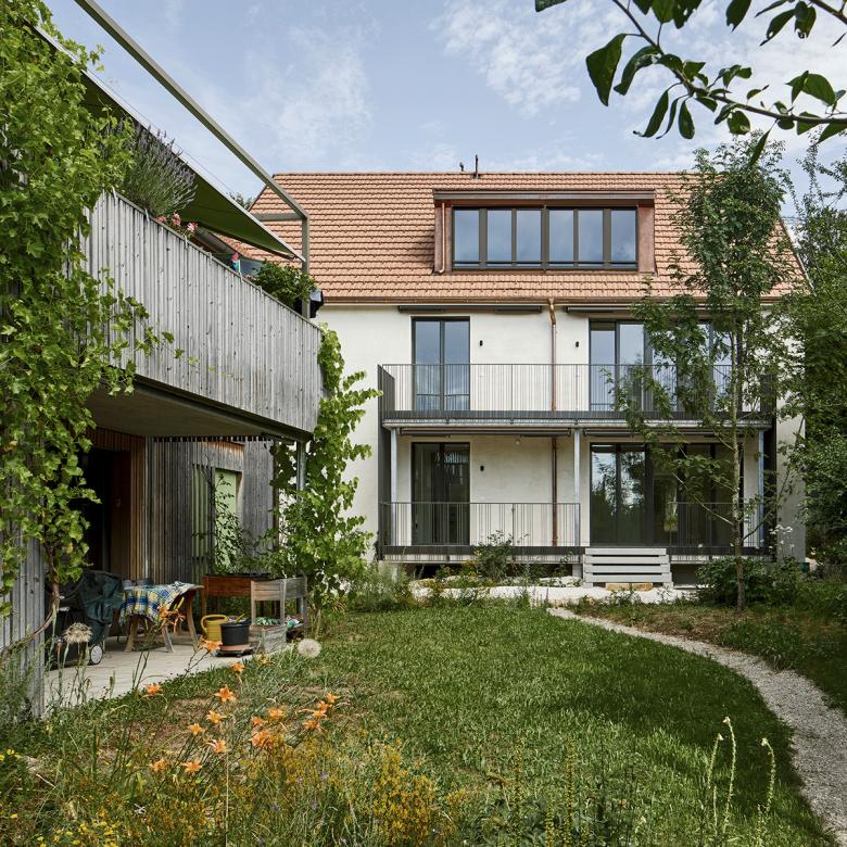 Die drei Baukörper (ein Ersatzneubau und zwei Neubauten) spielen durch den Verzicht von Vor- und Rücksprüngen, mithin in ihrer schlichten Gestalt, auf ehemalige Ökonomiegebäude in Hofstattbereichen an. Der Ersatzneubau, der zu einem späteren Zeitpunkt realisiert wird, nimmt die Bebauungsstruktur und Giebelausrichtung der Hauptstrassenbebauung auf und führt diese weiter. Zwei Neubauten entwickeln sich in die Tiefe der Parzelle und folgen dem leichtabfallenden Gelände, womit eine gewünschte Abstufung der Firsthöhen zwischen den beidseitig angrenzenden Strassenräumen entsteht. Mit ihrer Stellung akzentuieren sie den Ersatzneubau als Haupt- oder Kopfbau. Dadurch entwickelt sich der rhythmisierte Strassenraum mit sich verengenden und wieder ausweitenden Vorgärten und Plätzen weiter. Ein kleiner Platz, als Identität stiftender Ort, bildet den Auftakt der neuen, insgesamt zwölf Wohnungen und ein Studio umfassenden Überbauung.