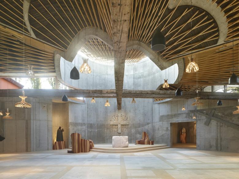 The church’s is characterised by exceptional volumes and archetypal forms that make it recognisable as a sacred space. A suspended light roof evokes a sense of upward tension while maintaining a link to nature through its organic geometries. The suspended canopy fans out undulating around a skylight, recalling both the image of a hot-air balloon and the shell of San Giacomo.