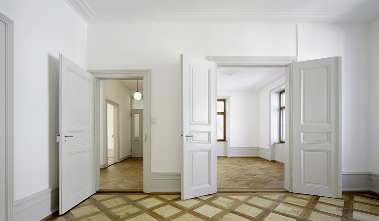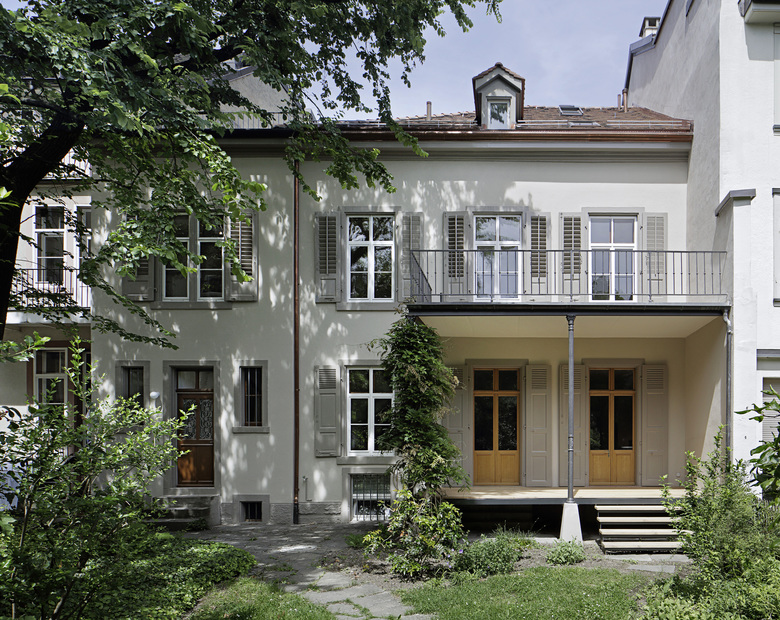 In einem Wohnquartier, das sich, in der Nähe des Birsigviaduktes verortet, befindet sich das 1876 erstelle Stadthaus. Es ist Teil des in der Gründerzeit entstandenen Strassenzuges zwischen Schützenmattpark und Bahnhof SBB, dessen intakte historische Bausubstanz durch typische Elemente der Industrialisierungsarchitektur des ausgehenden 19. Jahrhunderts geprägt wird. Der Byfangweg ist der Schutzzone zugeteilt. Das ursprüngliche freistehende Doppelhaus wurde seit seiner Entstehung mehrmals umgebaut und verändert. Das angebaute Treppenhaus zeugt von diesen Eingriffen. Im Zuge der Gesamtsanierung wird ein Umbau des Wohn und Geschäftshauses in zwei Wohnungen vorgenommen. Die baulichen Eingriffe fokussieren sich auf den Bereich der ehemaligen Erschiessungstreppe, wo die fehlenden Nasszellen eingebaut wurden. Die Küchen möblieren die gartenseitigen Zimmer. Diese werden als Enfilade über teils neue Verbindungstüren mit den Strassenzimmern verbunden. Trotz erheblicher Brandschutzmassnahmen wurde die historische Bausubstanz beibehalten und im Stil der Zeit ergänzt. Alt und Neu sind stilistisch miteinander verschliffen. Im Dachgeschoss wird im ehemaligen Estrich der Zimmerbereich der oberen Maisonette Wohnung eingebaut. Ein weiteres neues Element bildet die über dem Treppenhaus aufgeständerte Terrasse, die mitten in der Dachlandschaft wie ein Vogelnest im Astwerk der alten Bäume sitzt.