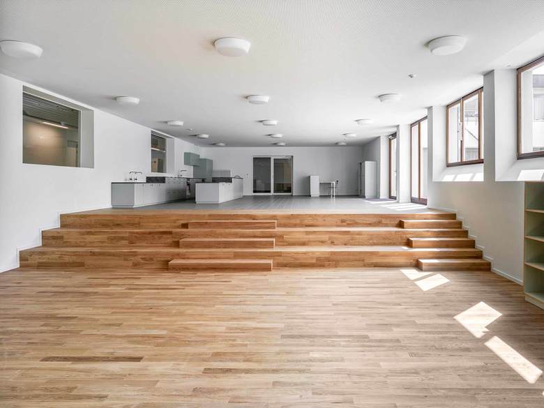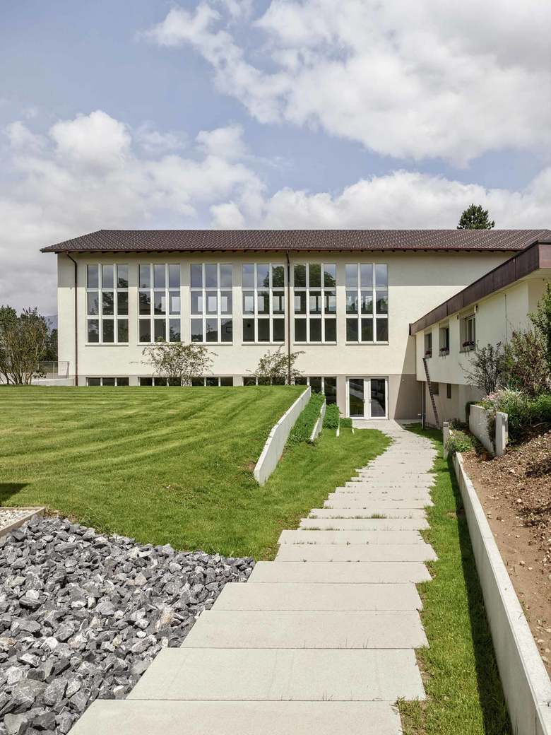 Über die niedrige Fassadenhöhe wird der Neubau zum abschliessenden Ergänzungsbau innerhalb der Schulanlage. Mit der Absenkung des grossen Neubauvolumens zeichnen sich oberirdisch nur die Haupträume ab und unterirdische wird eine Anbindung an den Bestand erreicht.Aufgrund der strassenseitigen Setzung konnte zum Bach hin ein gefasster Hofraum geschaffen werden, welcher die schulischen Aussenräume und die Sportplätze aufnimmt.