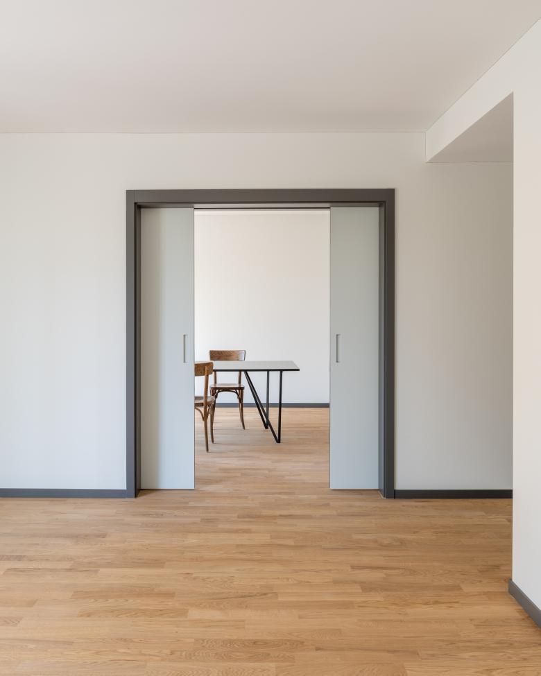 Die bestehenden Dielenwohnungen werden innerhalb der gegebenen Struktur an heutige Wohnstandards angepasst und mittels geringfügiger, jedoch präziser Eingriffe in ihrer Charakteristik verstärkt. Im Erdgeschoss und 1. Obergeschoss wird auf eine Zusammenlegung von Räumen, zu Gunsten der gegebenen Wohn-Typologie verzichtet. Im 2. Obergeschoss wird die Wand zwischen den gartenseitig gelegenen Wohn- und Essräumen entfernt, da sich hier durch die Untersicht des neuen Dachs eine räumliche Zonierung einstellt. Lediglich die Räume werden überhöht, welche dem dauernden Aufenthalt dienen, um die szenografische Wirkung dieser zu stärken. Während Küche und Wohn-/Essräume neu bis unters Dach reichen, bleibt in den übrigen Räumen die heutige Raumhöhe bestehen; der entstehende Binnenraum zwischen Bestand und neuem Dach wird zur Leitungsführung verwendet, wodurch ein konzentriertes Austreten dieser gewährleistet werden kann. Dem Dach wird eine Terrasse mit Blick vom Limmattal, über den See bis in die Alpen eingeschrieben.