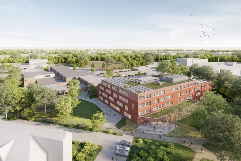 Die rote Klinkerfassade greift die Materialität des Bestands auf, interpretiert sie neu und akzentuiert über feine Details wie den Flämischen Verband besondere Bereiche. Die Umsetzung in Modulbauweise ermöglicht dabei eine zügige Realisierung und verbindet wirtschaftliche Effizienz mit einer nachhaltigen Bauweise.