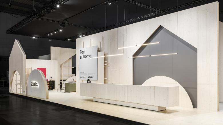 Bereits beim Betreten der Messefläche beginnt die Entdeckungstour. Die Außenfassade aus Fichtenholz lädt dazu ein, das warme Material zu ertasten und die offene Bauweise zu erkunden. Wechselnde Ein- und Ausblicke der Konstruktion gewähren erste Eindrücke des Markenkosmos. Im Inneren dienen die Negativ-Formen der Fassade als Rundbögen, die die Besucher*innen durch die vielfältige Küchenwelt leiten. Durch die Materialauswahl der Architektur, hebt sich die Premiummarke next125 strahlend ab. Kräftige Farben, samtmatte Oberflächen und elegante Formen wecken das Interesse, die Design-Neuheiten zu bewundern. Im Gegensatz dazu überzeugt die Schüller-Produktlinie, umgeben in modernen Wohnwelten, mit klaren Linien und hoher Funktionalität.