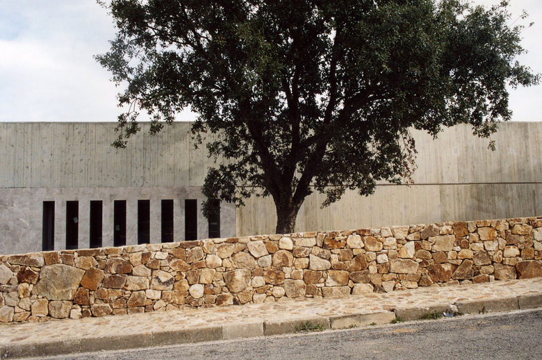 The house is build in concrete and raw stones of the surrounding landscape make the outdoors pavements and wall fences, belted with precast concrete lines.