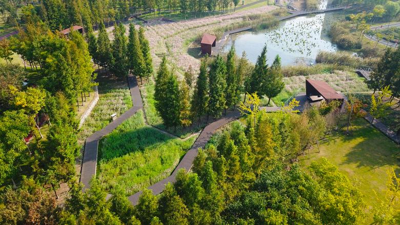 On the islands, densely planted Metasequoia and Cyprus groves divide space in the middle of the ecological corridor. The roots of the trees penetrate into water body to absorb nutrients and purify the water.