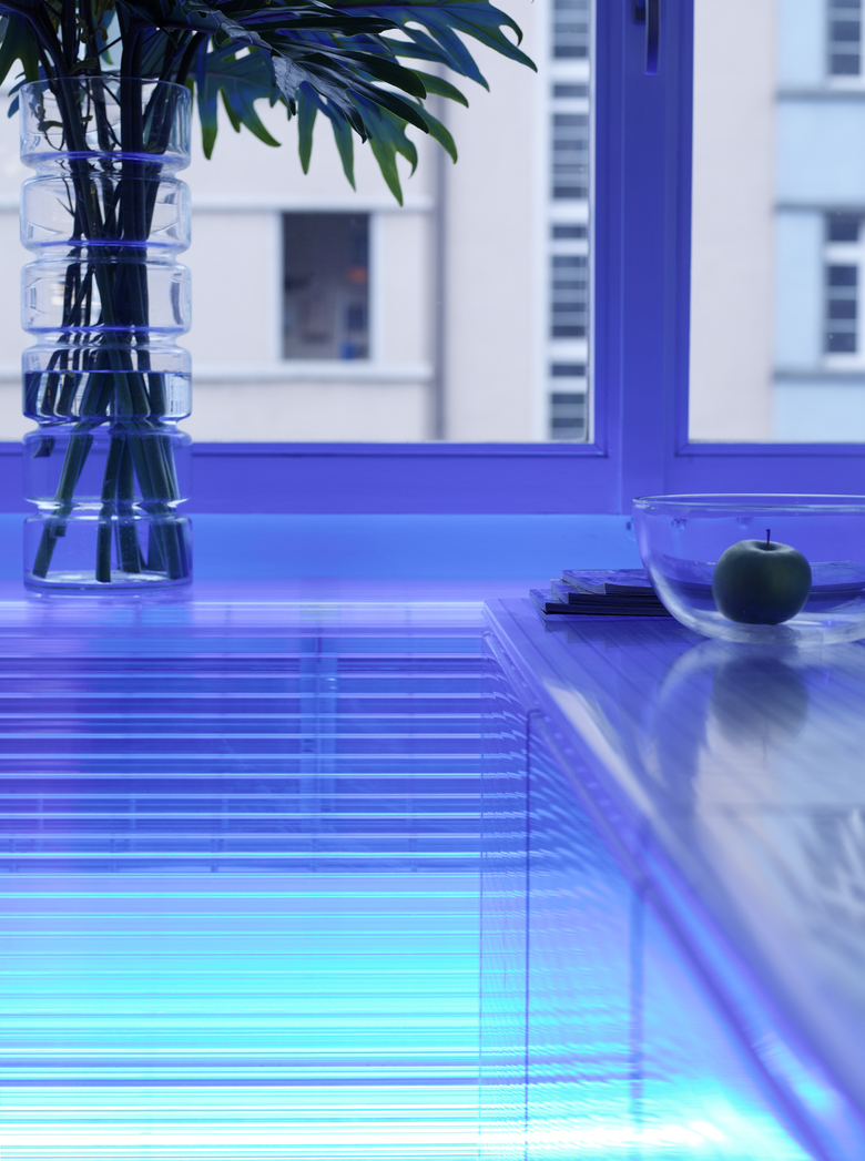 the reception and chill out area are the beach, situated at the south facade with the most amount of sunlight and views to the city of Zurich. the floor is made out of real sand, which we covered in a layer of transparent epoxy. so the surface is super slick, but you can see real sand as you walk on it, just like a beach. the radiators along side the inner facade we covered with polycarbonate and light it up to create a horizon (some blue light suggests the blue water of the sea).