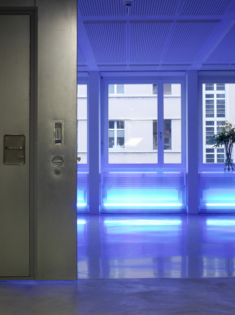 as everything is raw and visible we packed the existing installations into polycarbonate panels and put lights in them, so there are light beams playing along concrete beams and two L – shaped light walls that, once sliding open, create offices.