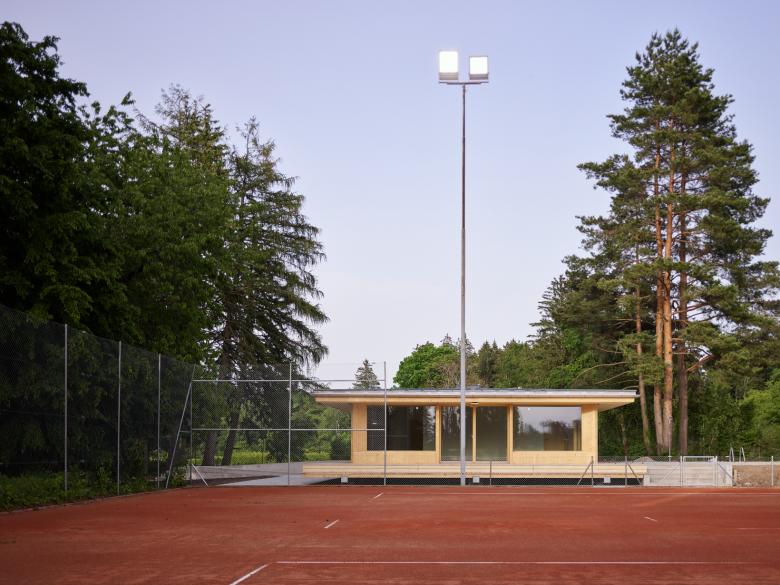 Am Waldrand von Zollikerberg gelegen, fügt sich das neue Tennisclub Haus still in seine natürliche Umgebung ein. Der flache, holzverkleidete Baukörper mit weit auskragendem Dach und umlaufender Terrasse wirkt wie eine Lichtung im Wald. Mit seiner langgestreckten Form und offenen Raumstruktur lädt das Clubhaus gleichermaßen zum Verweilen und zur Offenheit ein – stets im Dialog mit Bäumen, Himmel und Platz.