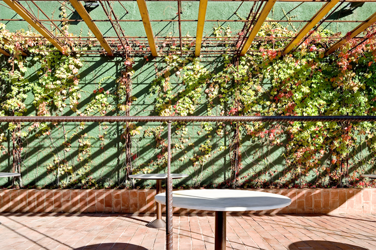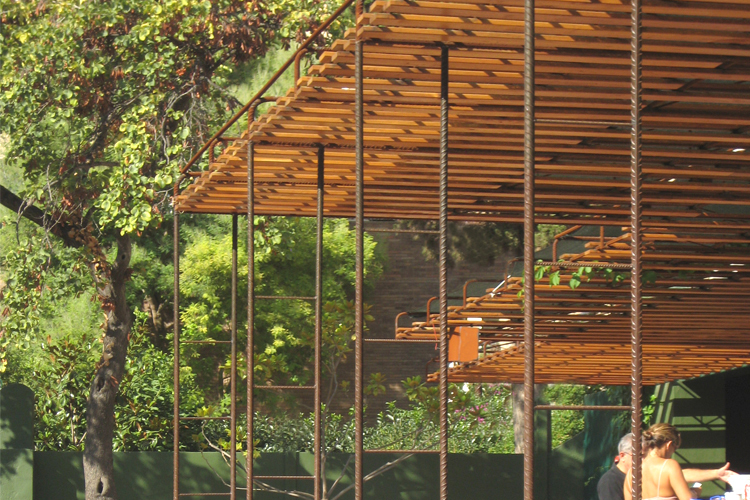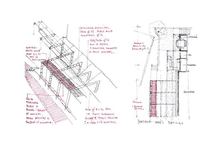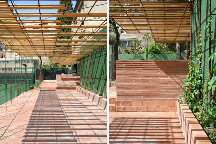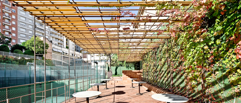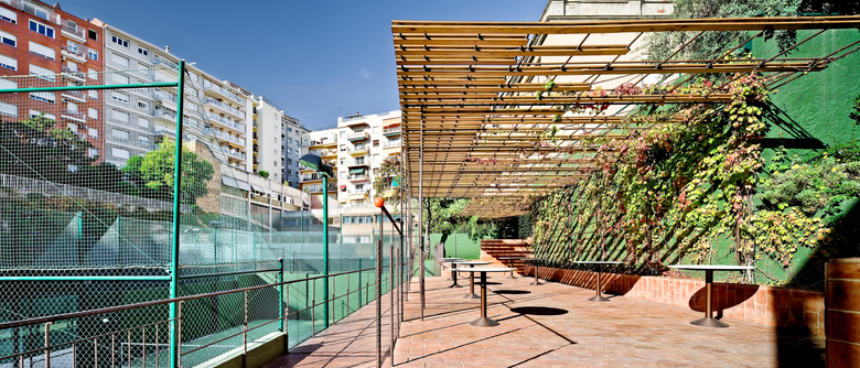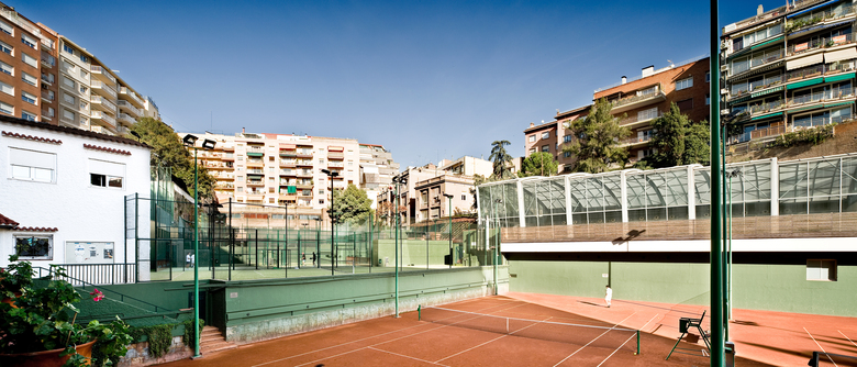 Since 1953, situated inside the interior of a Sant Gervasi’s neighborhood block, the Barcino’s Tennis Club it is a place where time has made successive urban transformations. Despite, the mark and the big emptiness that the old river carried out, they keep consolidated with the tennis court’s porous trace. The project approach the new paddle’s zone construction above north of the sport installations: -At level ±0.00m is projected the sportive program (3 paddle courts + 1 tennis court) with artificial grass as the only pavement. - Al level +2.50m and +3.00m it is placed a wood walkway that works as a tier over the central tennis court and a terrace-bar cover, reformed and enlarged searching the maximum continuity with the paddle courts and the swimming pool. It is worked with porous materials that synchronize with the pass of the time better than impermeable materials, planning the disposition between iron, terracotta, wood and vegetation with the intention of regulate the tem¬perature, optimizing a good shadow or sun depending on the period of the year. As a unic horizontal plane that with his own movements adapts to the scale of the different elements (tree of love, magnolia, bar, tables...), the cover is the intermediate between the natural light and the different atmospheres projected with the desire of maintain the essence of the old river, that by the time has become an urban lung garden.