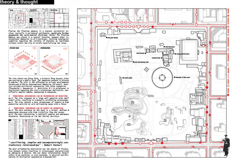China’s headlong rush to modernity, meteoric economic rise and schizophrenic urban growth has relied on the work force of hundreds of millions of Rural-Migrants which moved to swelling cities in search of advantageous economic conditions. Although they were fundamental in China’s transformation, Today Rural-Migrants remain trapped at the margins of urban society, due to a population registration system called the Hukou. Over 7 million Rural-Migrants account for almost 40% of the population in Beijing, yet there exists no official or collective representation. The proposal is an embassy for this excluded and under-represented portion of the population. It is an ambitiously holistic attempt to re-frame societal thought through a representation & physical manifestation of China’s most problematic immigration issue. Since the 1960s Beijing’s vernacular pedestrian-scale urban tissue came under pressure. Historical residential neighbourhoods were surgically removed & grafted with tracts of generic topdown-planned urban blocks. The human scale became a victim of modernisation. Beijing’s urban fabric now exists as a multi-scalar phenomenon which is defined by fragmentation. The Floating Embassy is a symbolic collage of these varying scales, attempting to represent the city; it’s scales & populations, in an experiential urban microcosm. Following the streetscape-orientated brief, the design attempts to critically question, exaggerate & explore the territorial boundary as a typology itself. The architectural expression evokes the imagery of ruins as a means to critically reflect upon the relentless aspirations of modernity within the Chinese capital. The embassy exists as an enduring, ageing monument to a population defined by impermanence. And through a utilitarian use of scaffolding, parts of embassy also appear under a perpetual state of construction. Visible notions of creation & destruction are therefore abstracted. The Floating embassy evokes an ambiguous, unfolding & symbolic sense of both preservation & construction of Beijing’s urbanism and society.