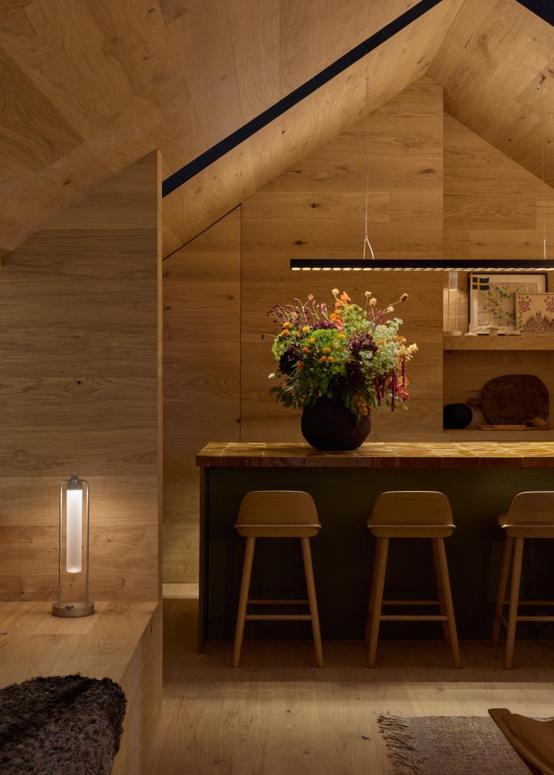 Inside, the cabin reveals a multi-sensory experience designed to slow the rhythm of the fair. The air carries the grounding scent of timber, accompanied by an ambient soundscape delivered through Devialet speakers. Lighting by Viabizzuno adds depth and softness, guiding the eye across natural textures and curated forms. Furnishings by Carl Hansen, &Tradition, and Muuto, curated in collaboration with Ikonhouse, reinforce the installation’s ethos of quiet beauty and timeless craftsmanship. Complementing these pieces are handmade ceramics by Sloo Studio, whose organically shaped forms and natural finishes introduce an added layer of warmth and artisanal refinement. Dark green oak doors by Fronteriors introduce contrast and richness, while tactile surfaces and warm materials complete the atmosphere. Visitors are welcomed with homemade cinnamon rolls served on antique plates, a gesture that encapsulates Nordic comfort and hospitality.