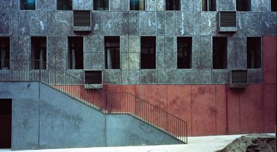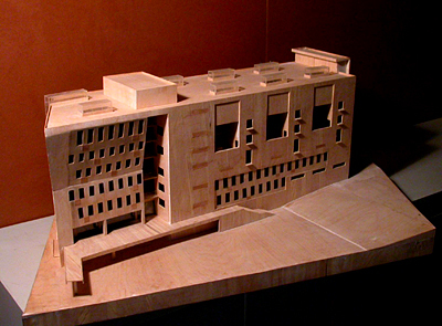 The sculpture department needs a large number of classrooms with daylight. The needed floor space was bigger than the ground-floor allowed. We decided to extrude the building out of the limits, in order to get the largest area on the top floor. Carved volumes on the main body light the fourth and fifth floor of the building.