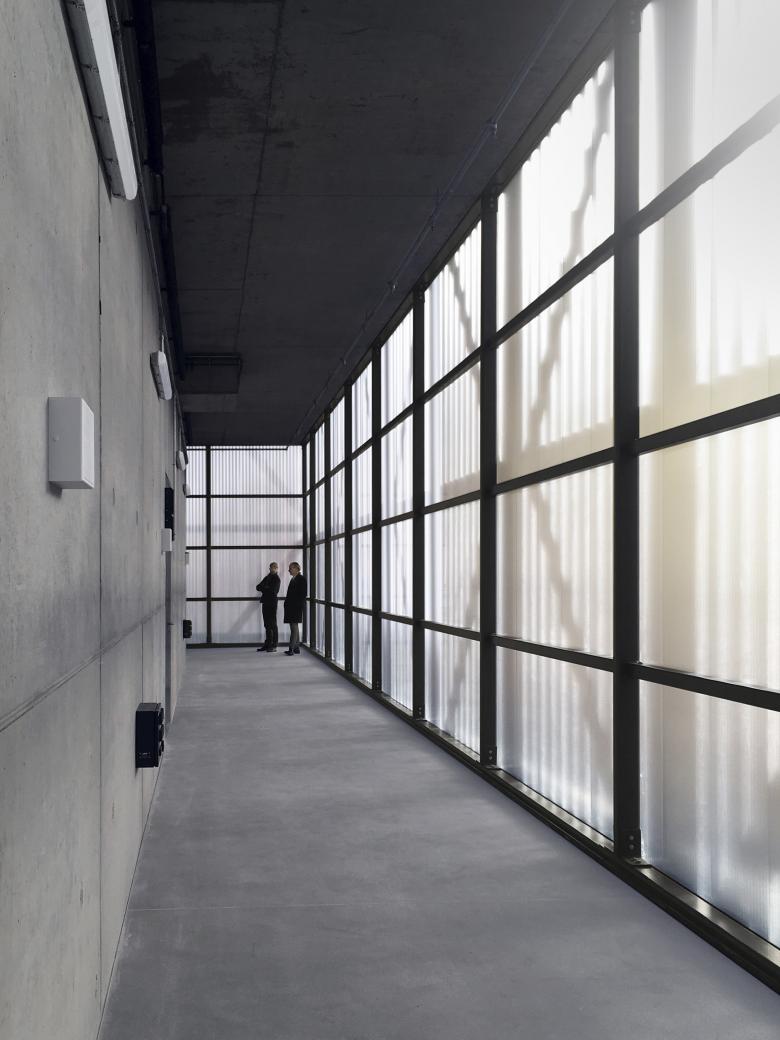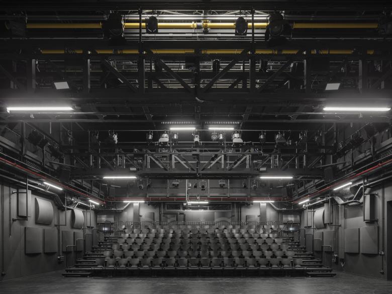 Von außen setzt sich das Haus aus drei Teilen zusammen: dem ertüchtigten Altbau, der an seiner Stirnseite aufgeschnitten wird, dem holzverkleideten Bühnenturm, der sich seitlich in diese Schnittstelle einklinkt und der gläsernen Mensa-Schachtel, die gegenüber an die Altbauflanke herangeschoben ist. Das Zusammentreffen von Rohem und Verfeinerten sowie Altem und Neuem zeigt sich in den Innenräumen an einer trennenden Linie, die sich auf einer Höhe von 2,30 m durch das gesamte Gebäude zieht. Alle Oberflächen unterhalb dieser Höhe sind verfeinert, die Bauteile darüber verbleiben in Ihrem vorgefundenen oder rohen Zustand. Der 24 Meter hohe Bühnenturm mit seiner Holzverschalung sorgt dafür, dass das Gebäude in der Zinnowitzer Straße von weitem als öffentlicher Ort erkennbar ist.